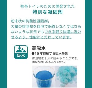 携帯トイレのために開発された粉末状の抗菌性凝固剤は、大量の排泄物を長期間自宅で保管しなくてはならないような状況でも、できる限り快適に過ごせるよう、性能にこだわっています。